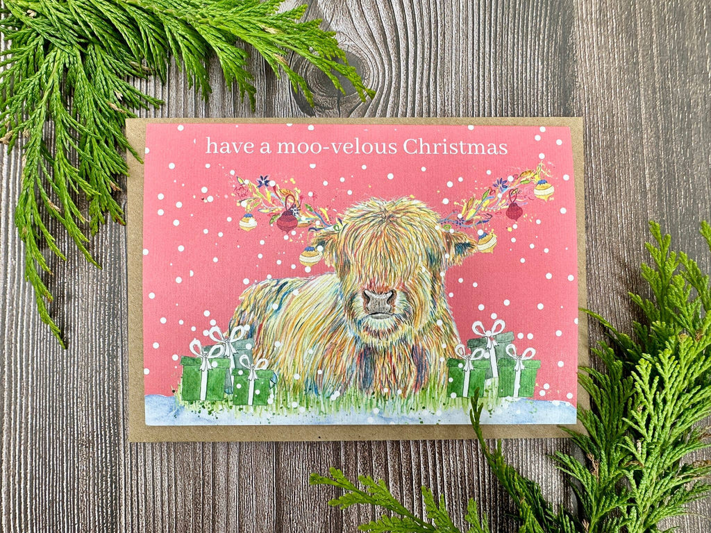 Christmas Highland Cow Eco Friendly Art Card Colourful Funny