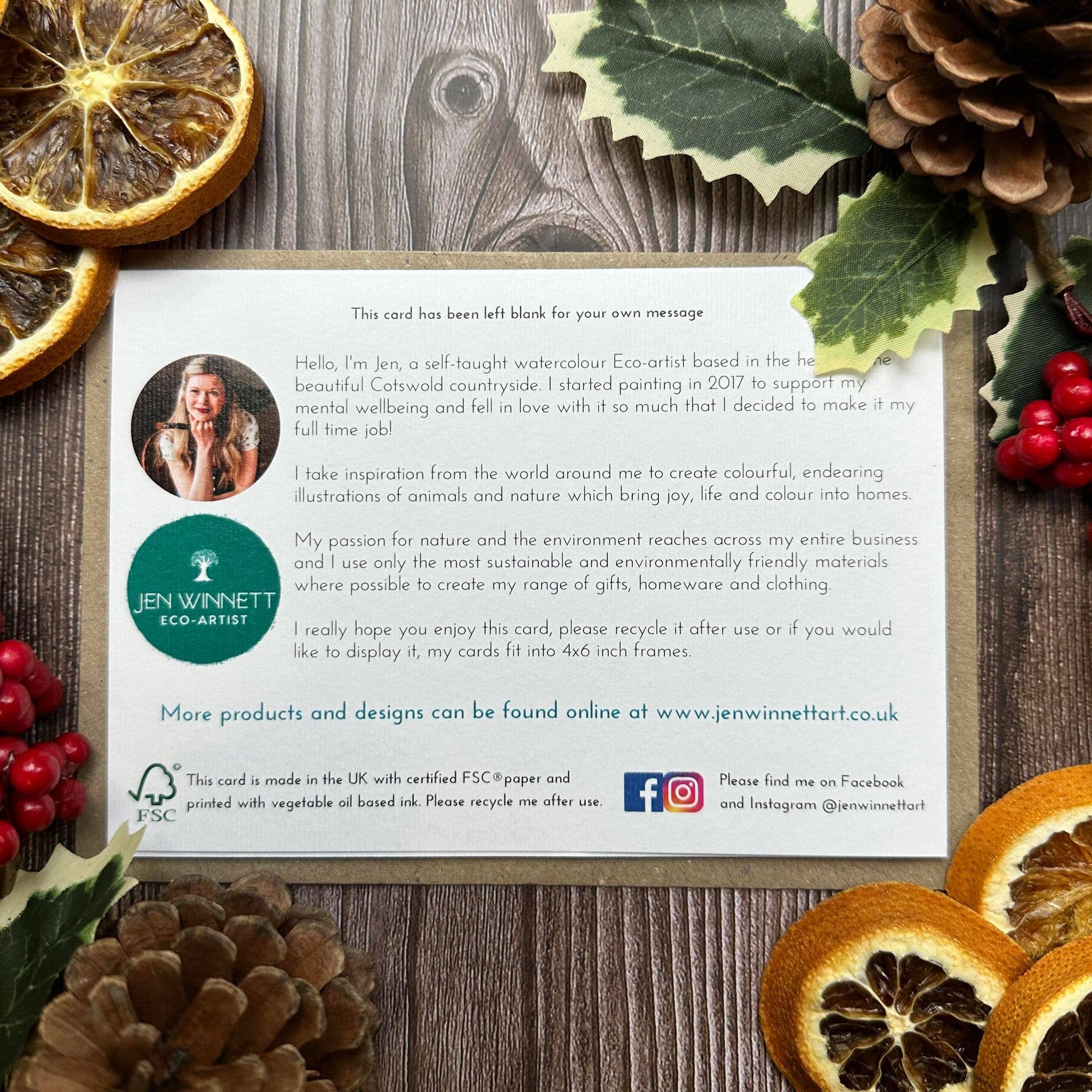 North Mole Christmas Eco Friendly Art Card cute funny Blank | Pun | Colourful | Nature | Art card | Watercolour | Unique | Farm| Different | Eco Friendly Card | Colourful | Blank | Friend | Family | | Occasion | Greetings | Xmas | Snow | By Jen Winnett Art | British wildlife Best seller! These Eco-Cards have been produced in the UK by a Carbon Neutral Eco-friendly company. In line with my ethos of minimising impact on our beautiful planet . All cards are printed using vegetable oil based inks on to FSC certified high quality textured card originating from responsibly managed forests and are 100% recyclable. Choose to have your cards sent naked or in sleeves made from 100% biodegradable corn starch They are A6 in size and come with a FSC brown kraft recyclable envelope. They are left blank inside so you can write your own messages.