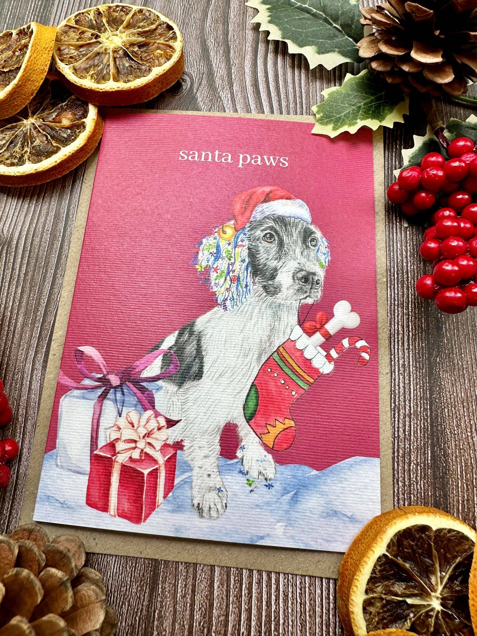Santa Paws Dog Christmas Eco Friendly Art Card cute blank | Pun | Colourful | Nature | Art card | Watercolour | Unique | Spaniel | Different | Eco Friendly Card | Colourful | Blank | Friend | Family | | Occasion | Greetings | Xmas | Snow | By Jen Winnett Art