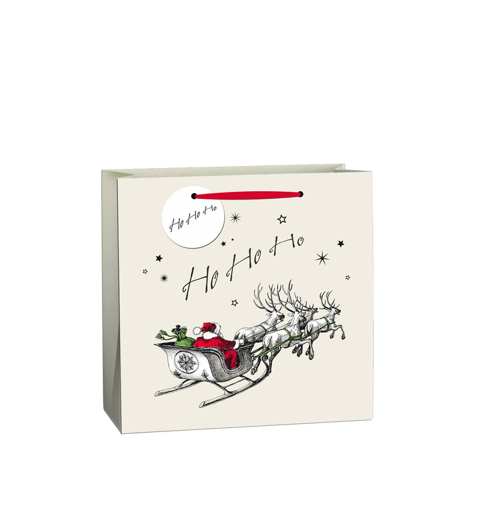 Paying homage to festive etchings of the Victorian era, this nostalgic and heart-warming range embraces the very essence of Christmas morning. Featuring traditional depictions of a Christmas tree, Santa Sleigh and Winter Scene - these bags are square with a wider gusset; a more practical shape. Printed on premium uncoated paper without any plastic film lamination, with a grosgrain red ribbon handle. Please note, due to the uncoated plastic-free nature of the material some light marking may occur. Bag sizes: