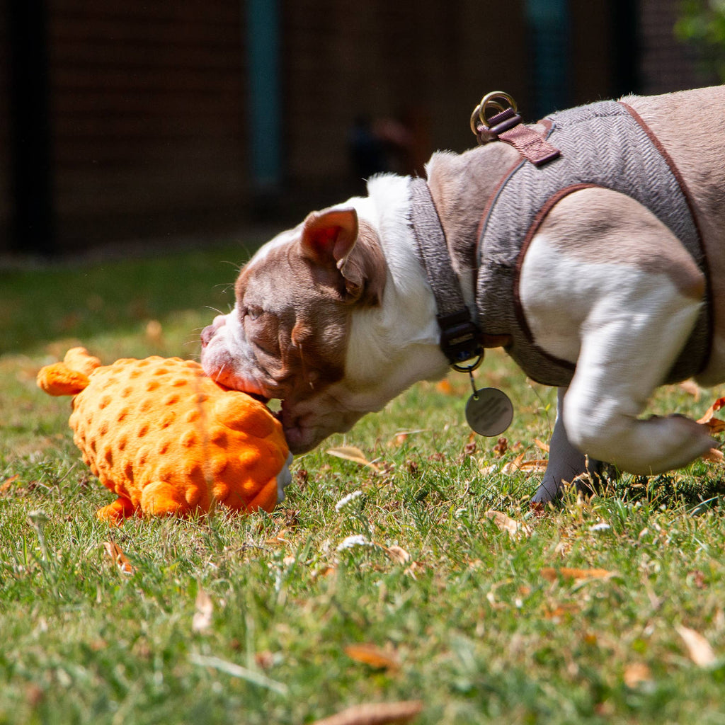 This Made From Puffer Fish is an earth-friendly toy that has 100% recycled outer fabrics and bouncy stuffing that was previously plastic bottles. Buying this product you are helping us turn post-consumer plastic waste into fun toys for dogs, lowering their carbon paw-print.