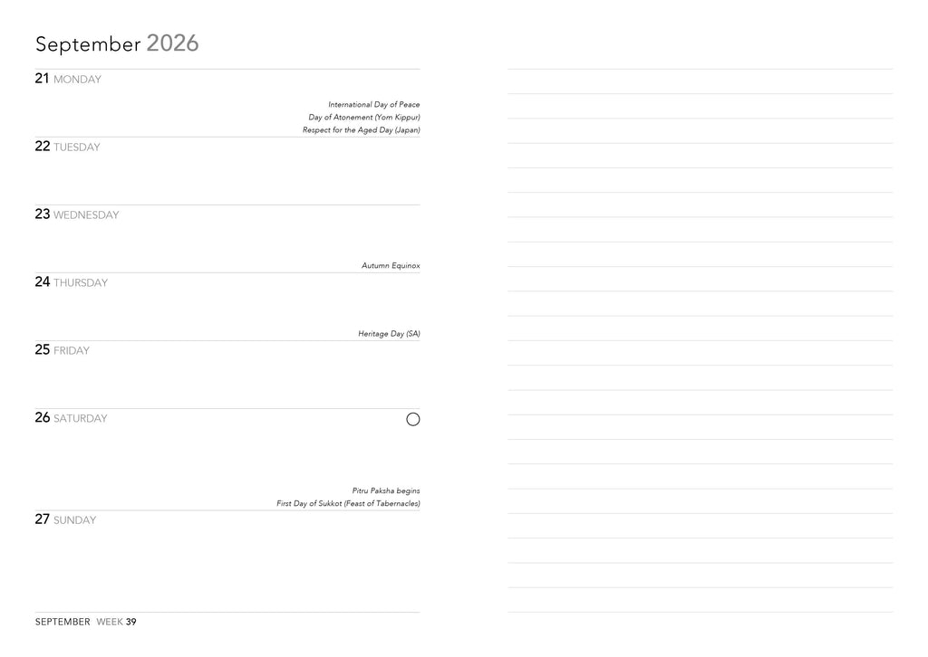 • Pages for notes opposite week-to-view.