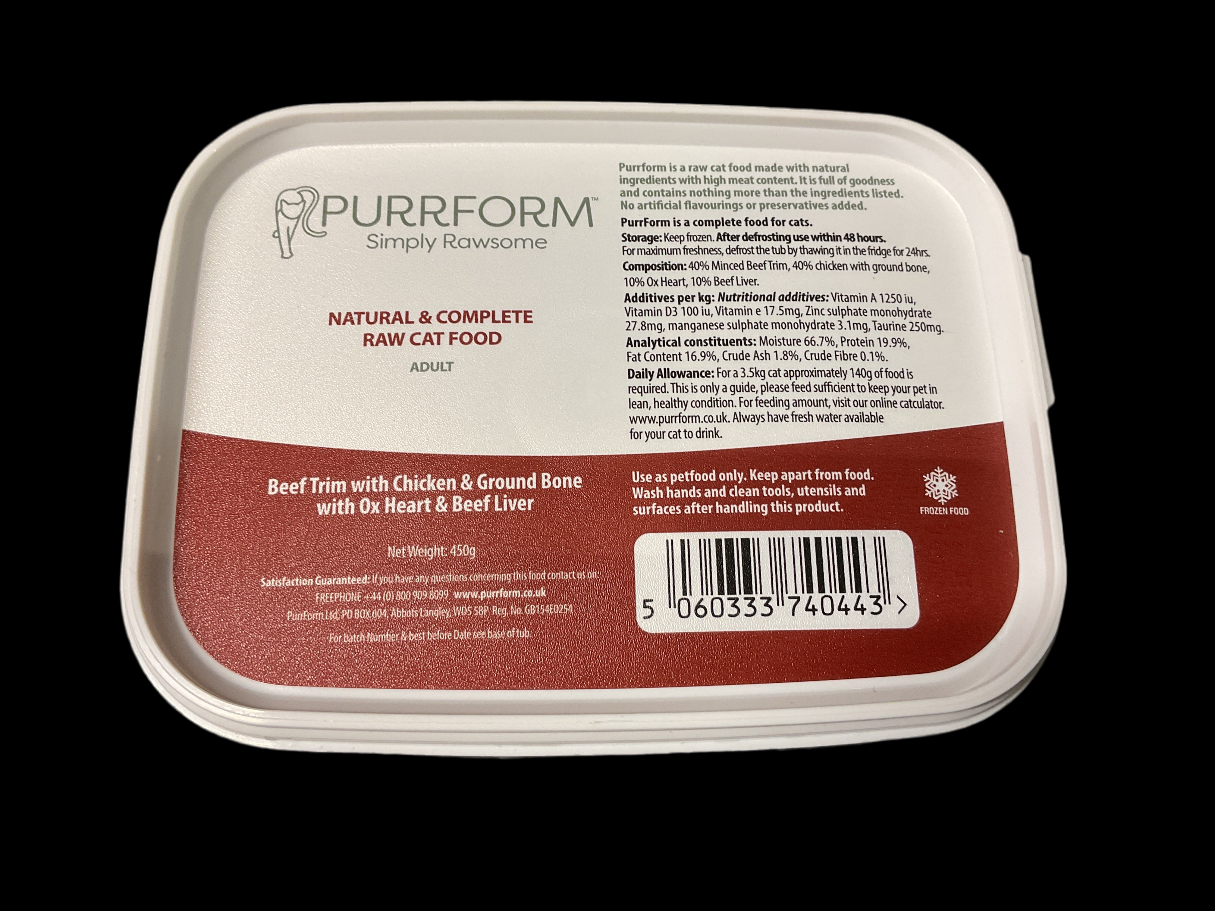Purrform Adult Beef Trim, Chicken & Ground Bone, Ox Heart & Beef Liver 450g